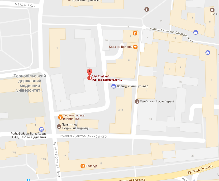 Контакти 46001, м. Тернопіль, вул. Йосипа Сліпого, 5 e-mail: art_clinique@ukr.net телефон: +38 (0352) 52 62 72 + 38 (097)0 52 62 72 Viber + 38 (097)0 52 62 72 Графік роботи Пн. – Пт. 10.00-19.00 Сб. 10.00-17.00 Неділя – вихідний Попередня